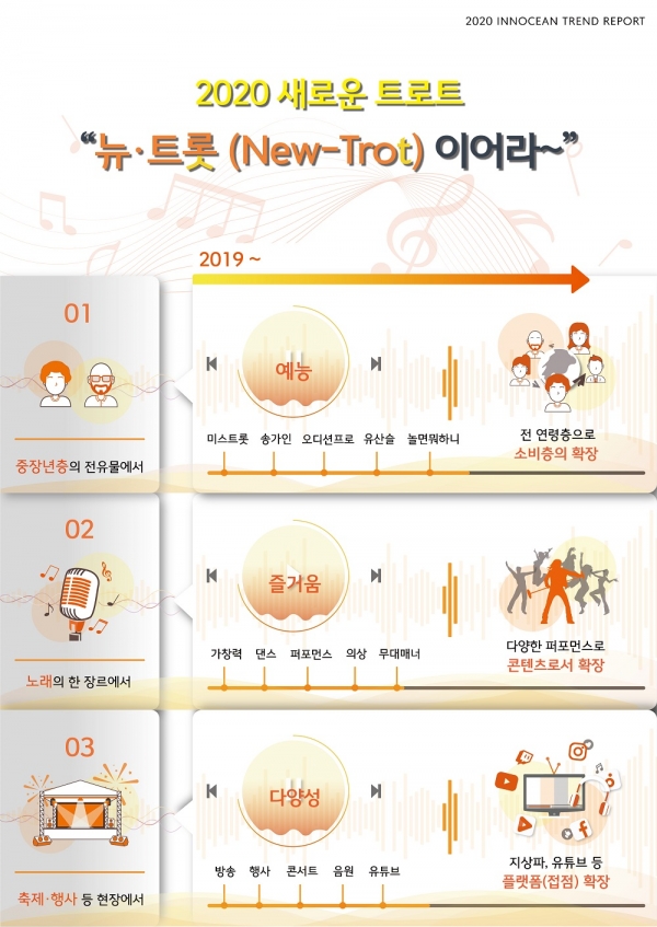 이노션의 이수진 데이터커맨드팀장은 “과거 중·장년층의 전유물로 여겨지던 트로트가 예능과 즐거움, 다양한 플랫폼을 기반으로 모든 세대가 공감하고 함께 즐길 수 있는 문화 콘텐츠로 자리 잡아가고 있다”며 “트로트가 오랜 세월 부침을 겪다 최근 콘텐츠의 중심으로 급성장했고 앞으로도 대중의 관심이 지속되며 ‘확장성 있는 콘텐츠’로 자리매김할 것으로 예상된다”고 말했다.