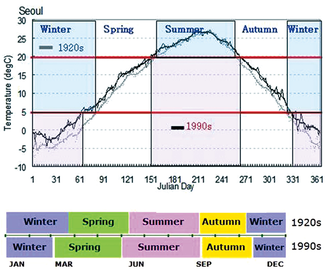 이 조사에 따르면 우리나라의 계절변화는 1920년대에 비하여 겨울이 한 달가량 짧아졌고, 봄과 여름은 20일 정도 길어졌다. 여름 시작이 빨라져감에 따라서 과거에 비하여 봄철이 일찍 사라지고 있음에도 불구하고 봄의 길이 자체는 점점 길어지고 있는데, 그 이유는 겨울이 일찍 끝나고 봄의 시작이 훨씬 빨라지고 있기 때문이다. 이러한 경향은 20세기 후반 들어 더욱 분명해지고 있으며 남쪽 지역일수록 더욱 뚜렷하였다. 그림 상에서도 1920년대에는 3월 하순에 시작되던 봄이 1990년대에는 2월 하순에 시작되고 있음을 볼 수 있다.