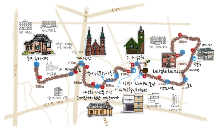 천개의 골목에 천개의 이야기가 숨어 있다는 대구광역시 중구에 위치한 근대골목은, 서문시장에서 김광석길까지 다섯 코스로 나누어 돌아볼 수 있는 곳이다. 이 골목에는 100년이 넘도록 한결같이 시민들의 마음에 안식을 주는 계산성당, 제일교회가 있고, 3·1만세길, 근대박물관, 1895년 우정업무를 시작한 대구우체국이 있다. 또 민족시인 이상화가 살던 집과 국채보상운동을 펼친 서상돈의 생가가 있는가 하면, 1946년 문을 연 고전음악 감상실 ‘녹향’이 그 시대부터 지금까지 음악의 역사를 품고 있다. 한국전쟁을 거치면서 전국에서 피난 온 예술인들이 머물며, 피난살이 중에도 문화와 예술에 대한 끈을 놓지 않고 활동하던 발자취를 곳곳에서 만날 수 있다.