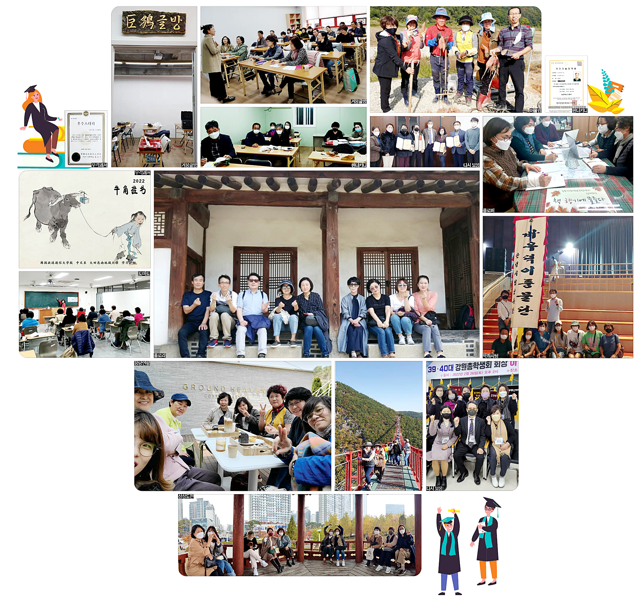 클로버 멤버는 50대에 입학해 올해 54~59세가 된 학우들이다. 갱년기로 몸과 마음이 힘들어질 시기지만, 학우들과 함께 즐겁게 학교생활을 하다 보니 갱년기도 수월하게 넘긴 듯하다. 공부가 조금 힘들다고 하면 책을 덮고 야외로 한 번씩 나가 시원한 바람도 쐬고 기분전환을 하기도 한다. 코로나로 인해 만남이 어려울 때는 전화 통화 또는 단톡방을 이용해 정보를 공유하며 유대관계를 유지하고, 모임 가능 인원이 되면 대면으로 만남을 이어가고 있다.