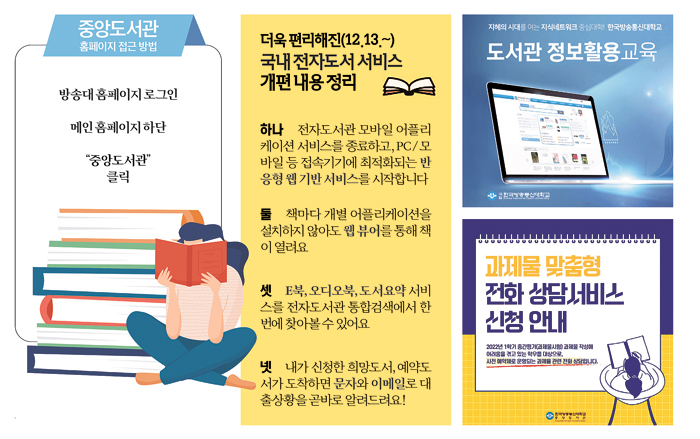 도서관이 책만 빌려보는 곳이라고? 중앙도서관(관장 사공환)은 직접 방문이 어려운 전국의 방송대 학생에게 어느 한 곳 빠짐없이 콘텐츠를 다양한 창구로 제공하고 있다. 학술 DB 검색부터 온라인 과제물 큐레이션까지, 방송대에서 공부하기로 결심했다면, 중앙도서관에서 제공하는 다양한 혜택들을 챙겨보자.