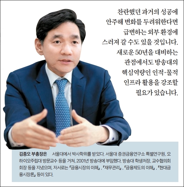 방송대는 올해 개교 50주년을 맞았습니다. 지나간 50년보다는 다가올 50년, 새롭게 준비할 50년의 무게가 더 큰데요. 흥미롭게도 부총장님 전공 분야가 ‘투자/위험관리’입니다. 특히 학령인구가 급감하고 있는 한국의 대학 현실에서도 이런 ‘투자/위험관리’적 접근이 가능할 것 같습니다.