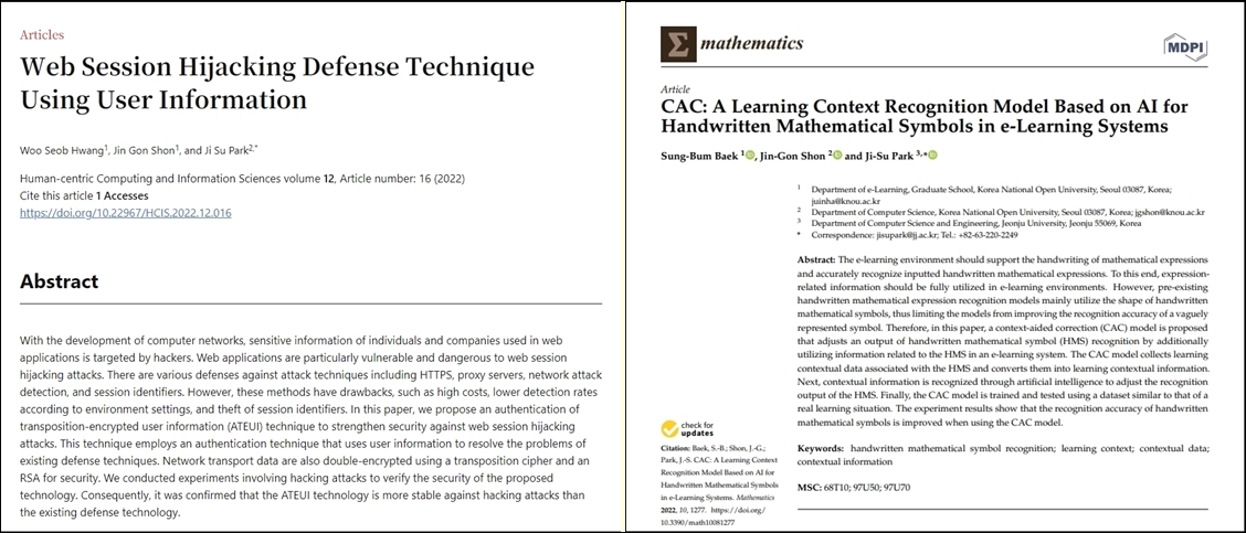 방송대 대학원 이러닝학과와 정보과학과를 각각 졸업한 백성범 동문과 황우섭 동문이 지난달 잇따라 SCIE Q1급 논문을 출간했다. 백 동문은 <Mathematics>지에 「CAC: A Learning Context Recognition Model Based on AI for Handwritten Mathematical Symbols in e-Learning Systems」을, 황 동문은 <Human-centric Computing and Information Sciences(HCIS)> (이하 ‘HCIS’)지에 「Web Session Hijacking Defense Technique Using User Information」을 각각 발표했다.