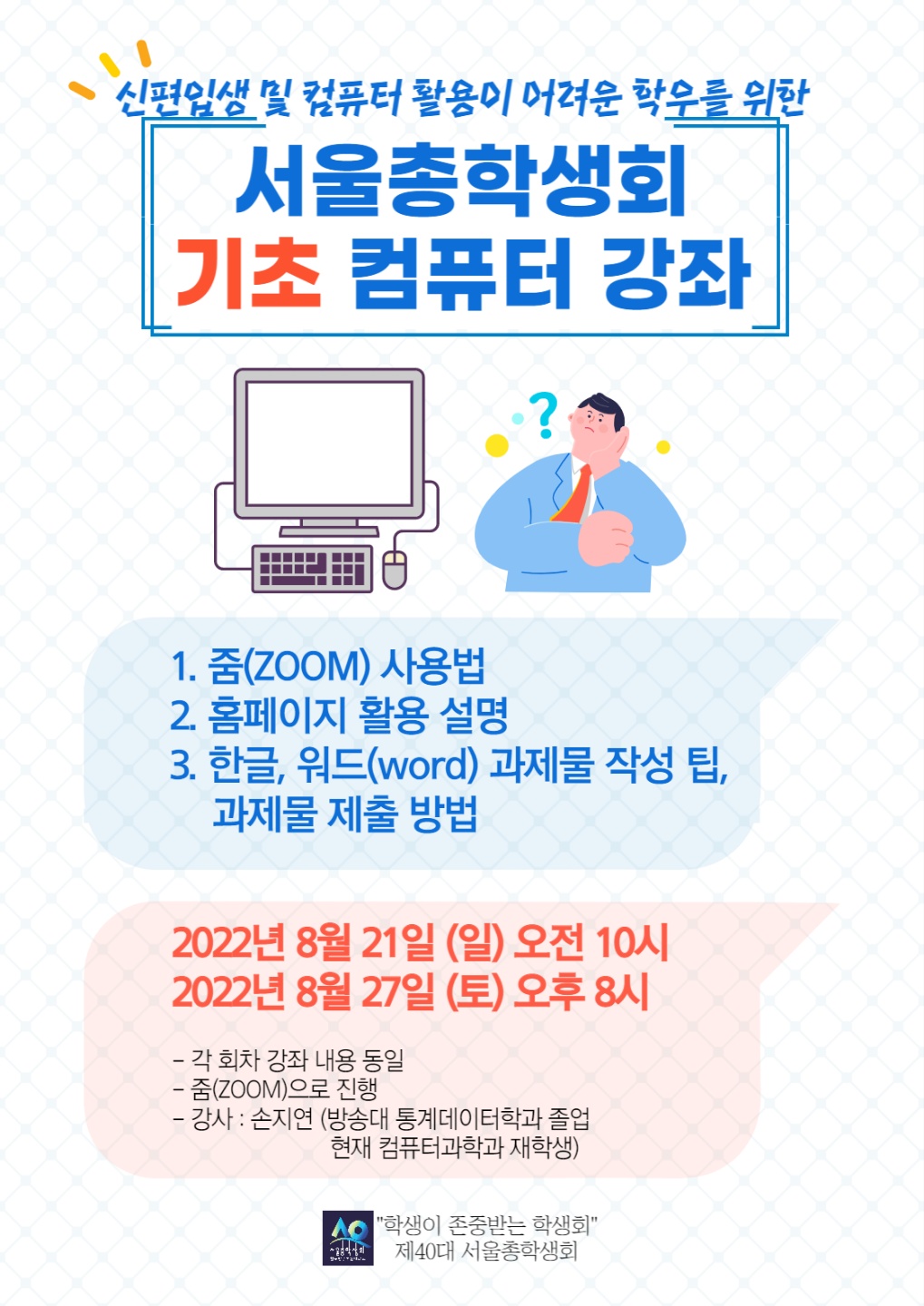 방송대 서울지역총학생회(회장 장봉은)가 신·편입생들의 학교 적응을 돕기 위해 ‘기초 컴퓨터 강좌’를 개최한다. 21일 1회차에 이어 27일 오후 8시에 ‘줌’에서 강좌를 진행한다. 강사는 방송대 통계·데이터과학과를 졸업하고, 현재 컴퓨터과학과에 재학 중인 손지연 학우다. 오프라인 출석 수업을 대체해 자주 사용되는 ‘줌’ 이용법과 방송대 홈페이지 활용법, 과제물 작성 팁을 안내할 예정이다.