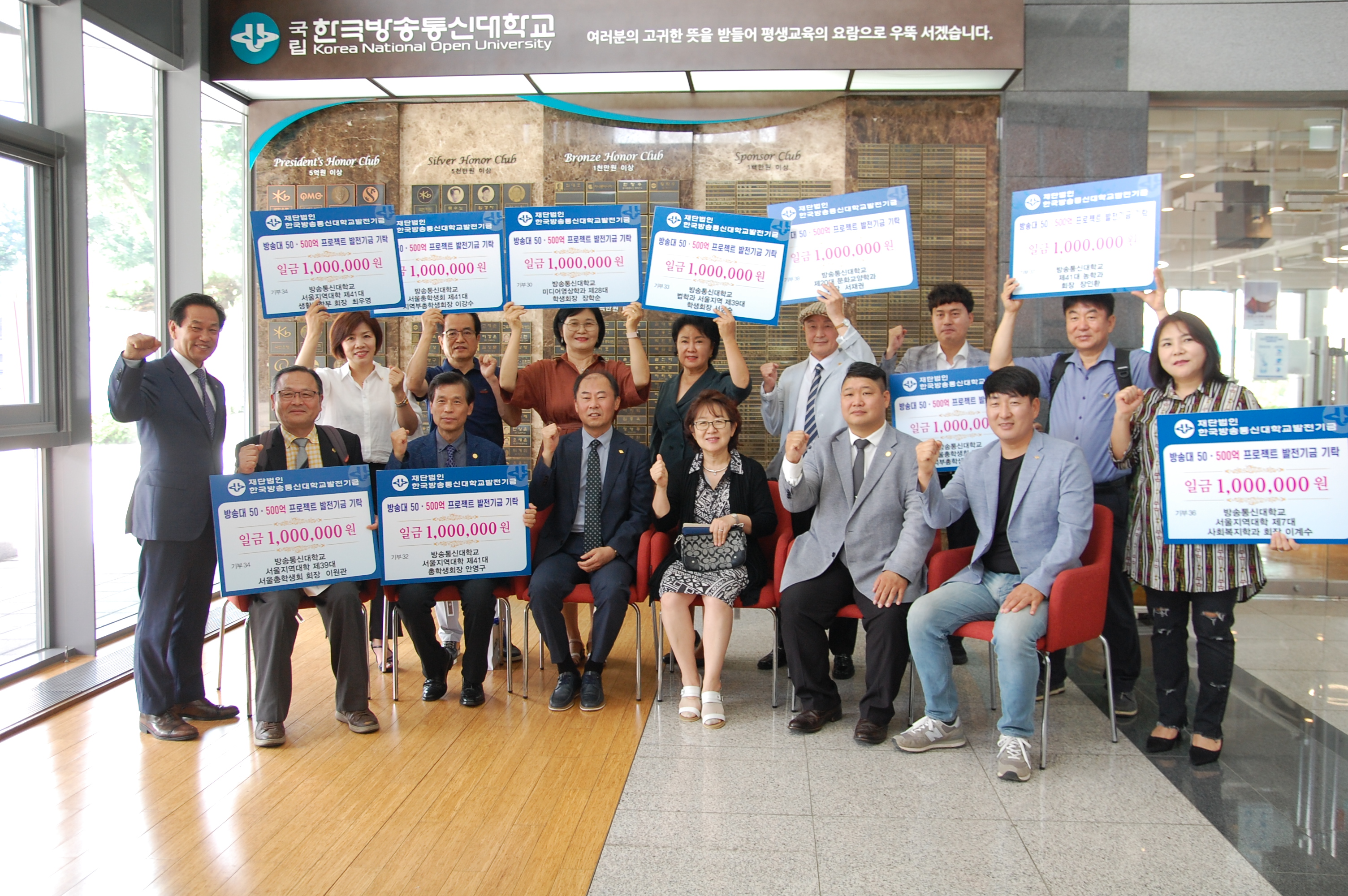 방송대 서울지역대학 제41대 총학생회(회장 안영구)가 8월 3일(목) 11시 대학본부를 찾아 50·500 발전기금 모금에 동참했다. (왼쪽부터) 김흥진 50·500 사무총장, 이원관 39대 서울총학생회장, 최우영 서울 41대 생활과학부 회장, 안영구 서울총학생회장, 이강수 서울총학생회 41대 지역부총학생회장, 장학순 미디어영상학과 28대 학생회장, 고성환 총장, 서정숙 법학과 서울지역 39대 학생회장, 이해주 서울지역대학장, 서재권 문화교양학과 20대 회장, 서평일 41대 전국총학생회장, 이현범 서울총학생회 41대 수석부총학생회장, 김교호 40대 전국총학생회장, 장인환 41대 농학과 회장, 이계수 서울지역대학 7대 사회복지학과 회장. 이날 백만복 인천총학생회장과 임원들도 함께 기탁식에 참석해 고성환 총장과 차담회를 하고 기념촬영을 했다.고건영 학생기자 kwankyo7@naver.com