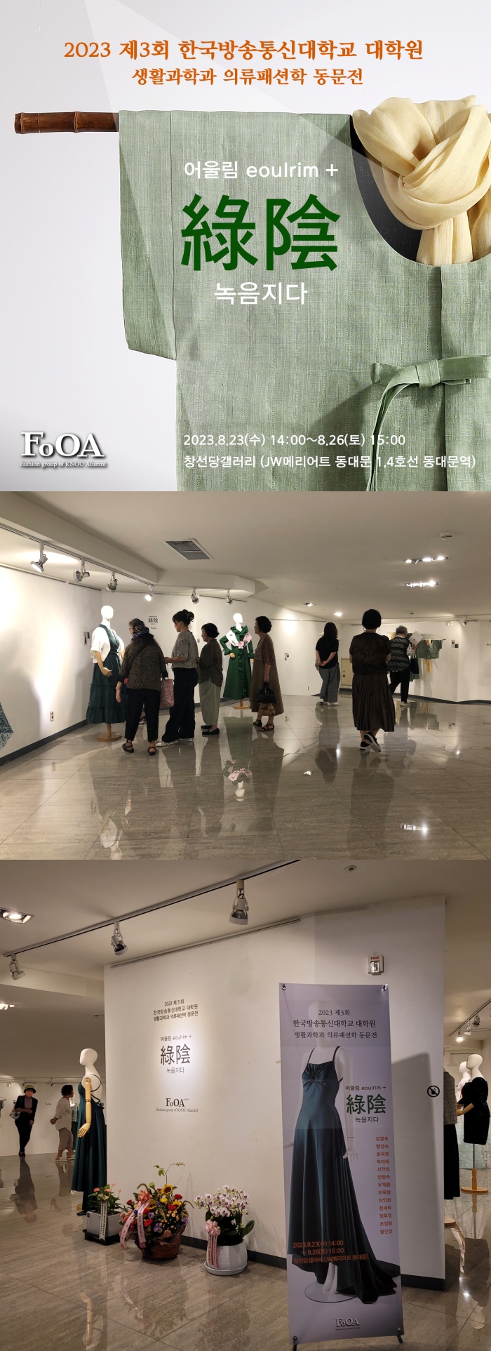 이번 전시의 주제는 ‘어울림 + 녹음(綠陰)지다’로 다양한 의상에서 초록의 희망을 표현하고자 했다. 동문전을 개최한 주체는 FoOA(Fashion group of KNOU Alumni) 그룹으로 생활과학과 의류패션전공 대학원 졸업생으로 구성돼 있다. 의류패션학 전공자를 주축으로 전시회를 개최함으로써 개인의 역량을 높이고, 동문 간 소통에 힘쓰고 있다. 이번 동문전에는 졸업생과 대학원 재학생 12명이 참여했다(김영숙(10기), 맹경숙(12기), 문숙영(8기), 박미애(11기), 서연희(15기), 양향숙(8기), 이옥형(16기), 이인화(15기), 정세희(10기), 정후정(10기), 조정화(15기), 황인선(19기). 가나다순). 초록 계통의 색을 녹음과 연관해 통일성을 준 다양한 옷들을 선보였다.