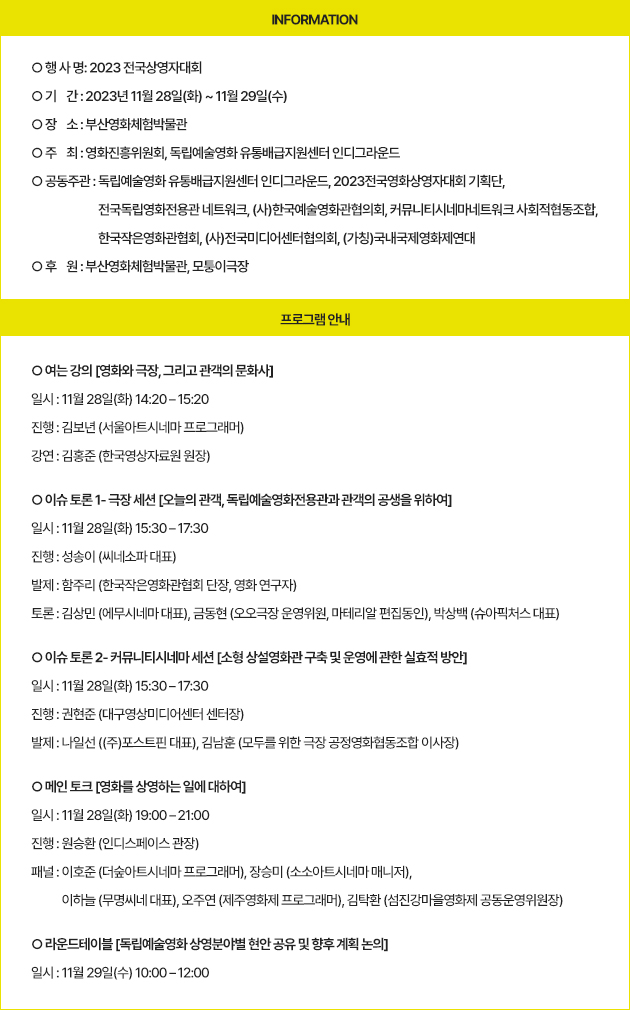 한국 독립예술영화의 유통 배급 환경 개선을 위해 영화진흥위원회(위원장 박기용)에서 설립한 인디그라운드가 11월 28~29일에 부산영화체험박물관에서 ‘2023 전국영화상영자대회’를 개최한다.