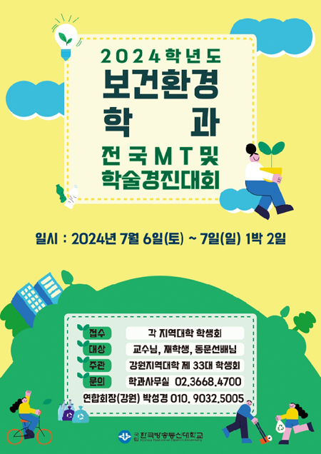 시상식은 오는 7월 6일 전국 보건환경학과 MT 및 학술경진대회에서 수상할 예정이다. 공모는 이메일 jin5659@mail.knou.ac.kr로 접수하면 된다. 학과 게시판에 제출해야 하는 합격수기 양식, 개인정보 수집이용 동의서 등이 첨부파일로 제시돼 있다.