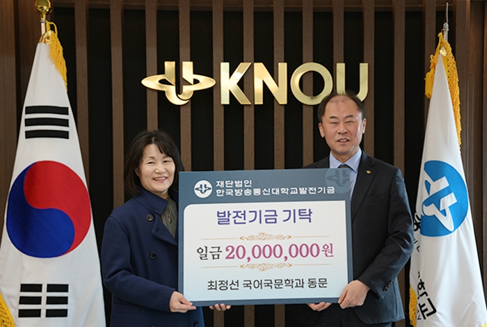 2011년 국어국문학과를 졸업한 최정선 동문(62세)이 2월 27일 대학본부를 방문해 고성환 총장에게 발전기금 2천만 원을 기탁했다. 최 동문은 매년 500만 원을 국어국문학과 다연장학회에 출연해 왔는데 올해부터는 발전기금재단에 기탁(용도: 국어국문학과 장학사업)하기로 했다.