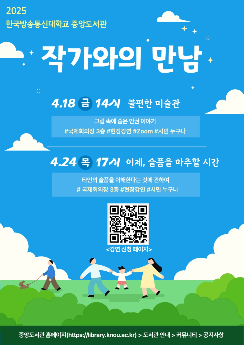 작가와의 만남은 대학 본부 국제회의장 3층 화상회의실에서 열린다. 참여 인원은 총 160명이며, 1차 강연은 현장 30명과 실시간 온라인 ZOOM 100명,을 2차 강연은 현장 강연으로만 진행하며 30명을 모집한다. 방송대 재학생은 물론 졸업생, 교직원과 일반시민도 참여할 수 있다. 중앙도서관이 진행하는 4월 작가와의 만남에 참여하고 싶다면 포스터 안에 있는 QR코드로 접수하면 된다.