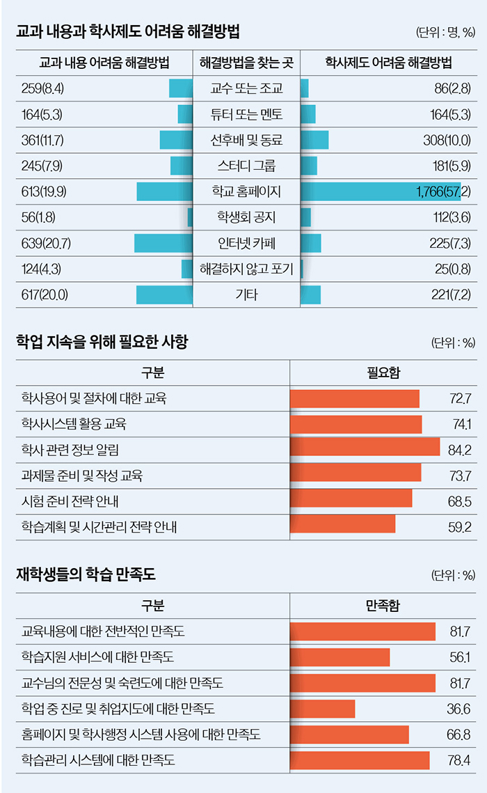 ‘학사제도 어려움 해결방법’으로 ‘학교 홈페이지’가 57.2%로 가장 높고, ‘선후배 및 동료’ 10.0%, ‘인터넷 카페’ 7.3%, ‘기타’ 7.2%, ‘스터디 그룹’ 5.9%, ‘튜터 또는 멘토’ 5.3% 순이었다.