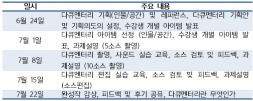 다큐멘터리 제작 워크숍은 미디어영상학과 학우들의 효과적인 실습 교육을 위해, 개인별 아이템 기획부터 촬영실습 및 완성작을 만드는 과정으로 기획됐다. 7월 말에 예정된 영상 제작 아카데미(극영화 제작)가 팀별 협업 작업이라면, 이번 워크숍은 개별 프로젝트여서 학우들이 다큐멘터리 제작 처음부터 끝까지 직접 참여해 볼 수 있는 것이 특징이다.
