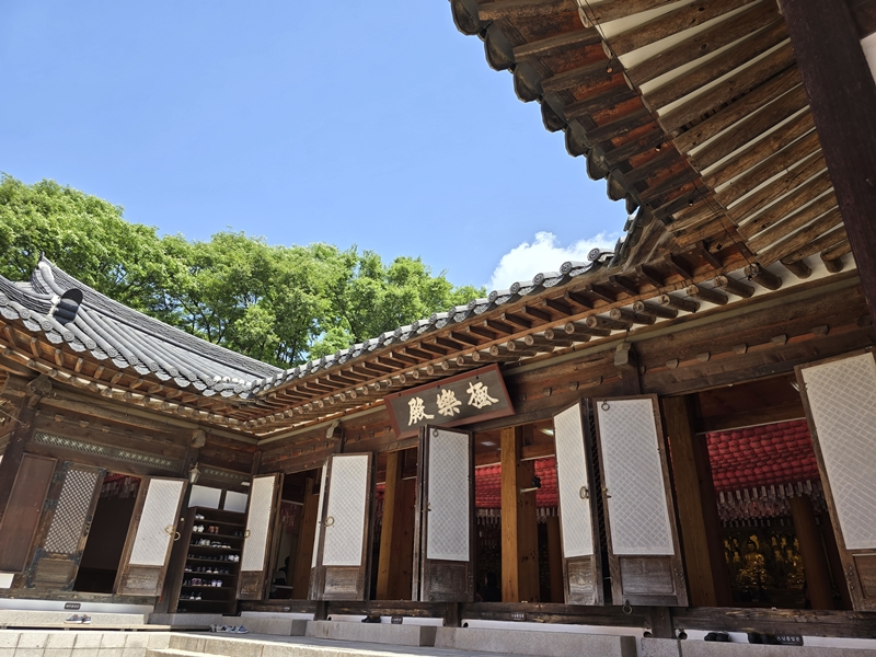 절 중앙에 있는 극락전(極樂殿)은 여타 절에 비해 작은 규모다. 특히 건물 자체가 전통 한옥이기에 다른 절의 건물들에 비해 소박하면서도 절제된 아름다움을 느낄 수 있다. 낮은 높이의 극락전 한옥에는 다른 절의 법당들처럼 화려한 단청은 없지만 나무의 고유한 색을 간직한 처마의 풍만한 곡선이 유려하게 펼쳐져 있다. 바라볼수록 아름답다는 속마음이 절로 드는 건물이다.