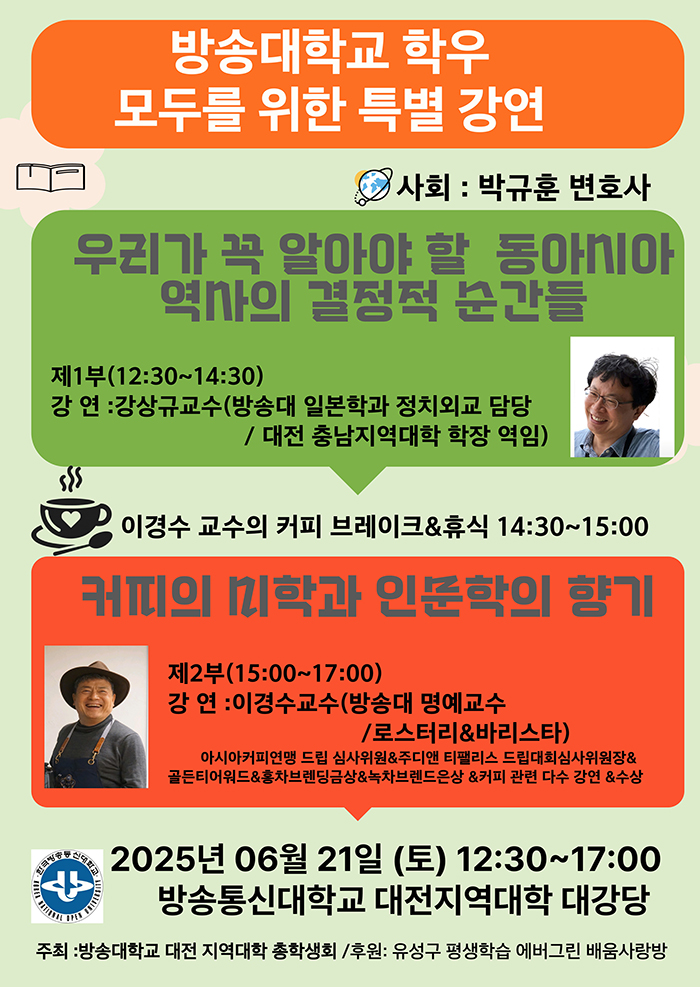 일본학과의 강상규 교수와 이경수 명예교수가 오는 6월 21일(토) 낮 12시 30분부터 오후 5시까지 대전·충남지역대학 대강당에서 ‘방송대 학우 모두를 위한 특별 강연’에 나선다.