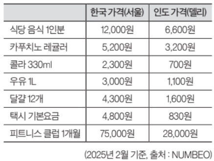 물가도 한국에 비해 매우 낮다. 코카콜라 330ml 제품의 경우 한국에선 2천300원대인 반면, 인도 델리에선 약 700원이다. 침실 한 개가 딸린 시내 아파트 월세는 서울이었다면 100만 원을 훌쩍 넘기지만, 인도 델리에선 36만 원 정도다.