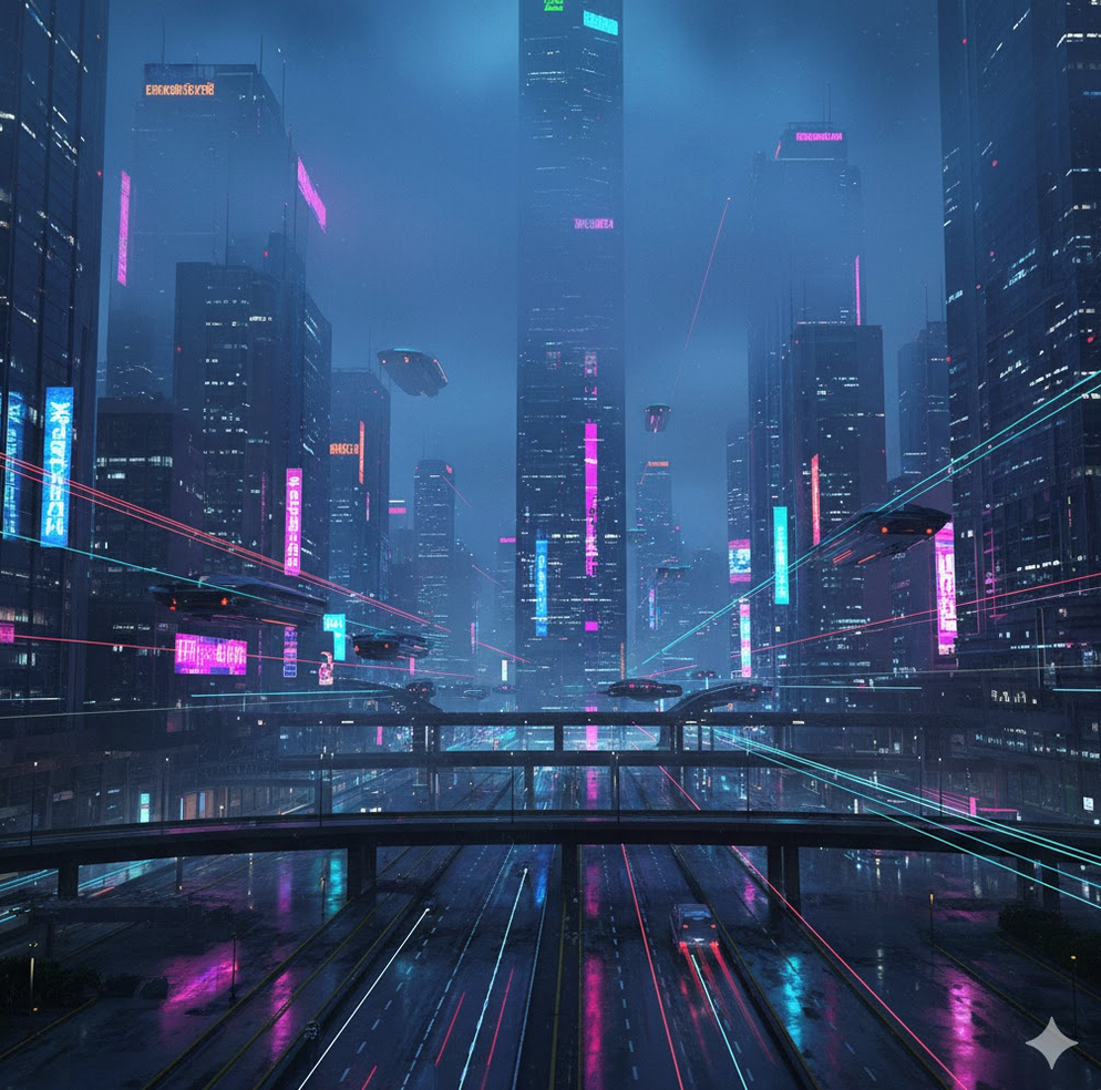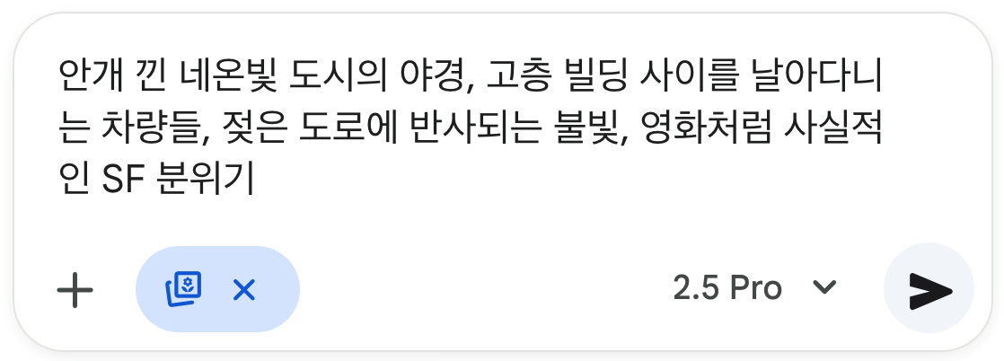 프롬프트: 안개 낀 네온빛 도시의 야경, 고층 빌딩 사이를 날아다니는 차량들, 젖은 도로에 반사되는 불빛, 영화처럼 사실적인 공상과학 분위기