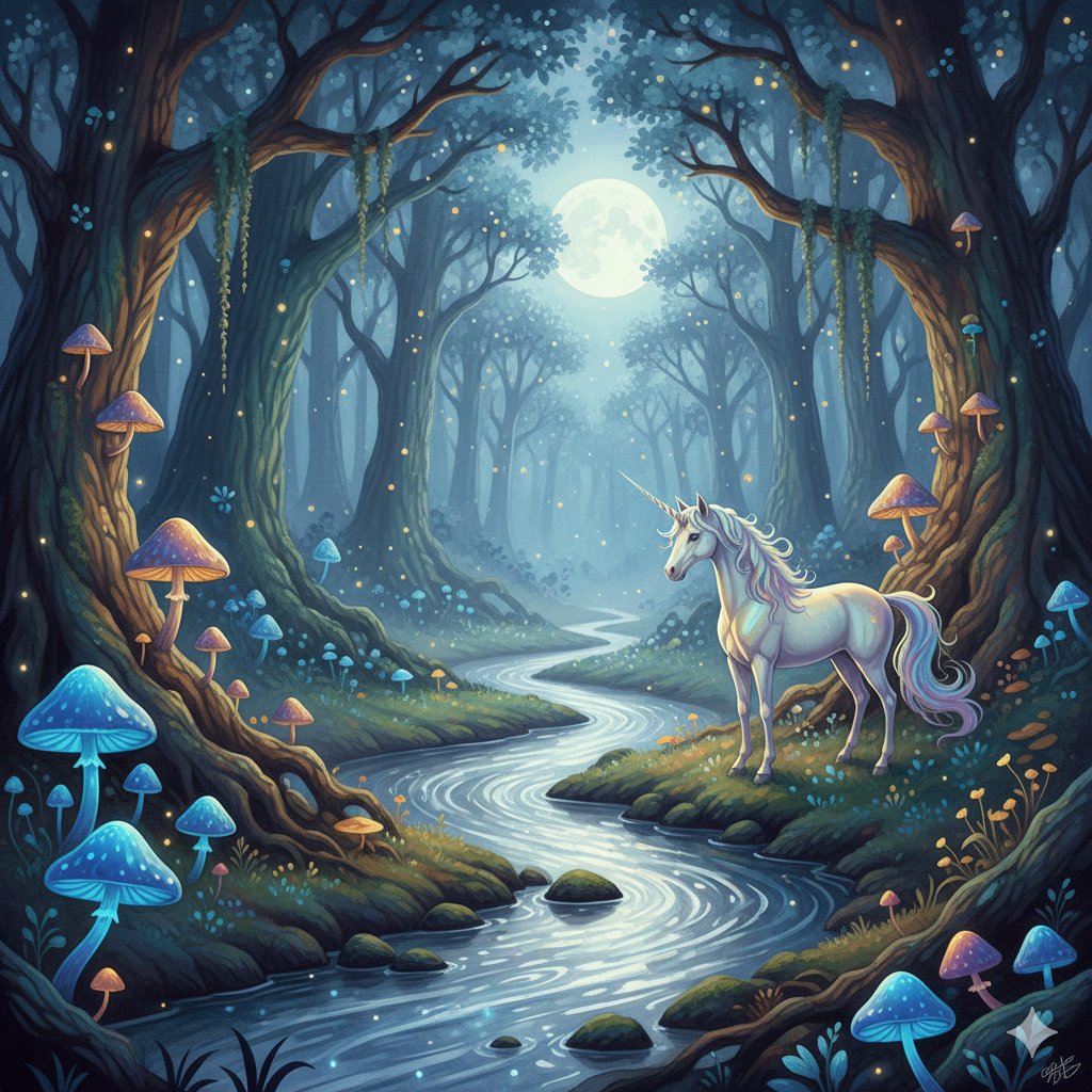 프롬프트: 빛나는 버섯과 유니콘이 있는 고대 숲, 달빛이 흐르는 강가, 따뜻하고 몽환적인 판타지 일러스트