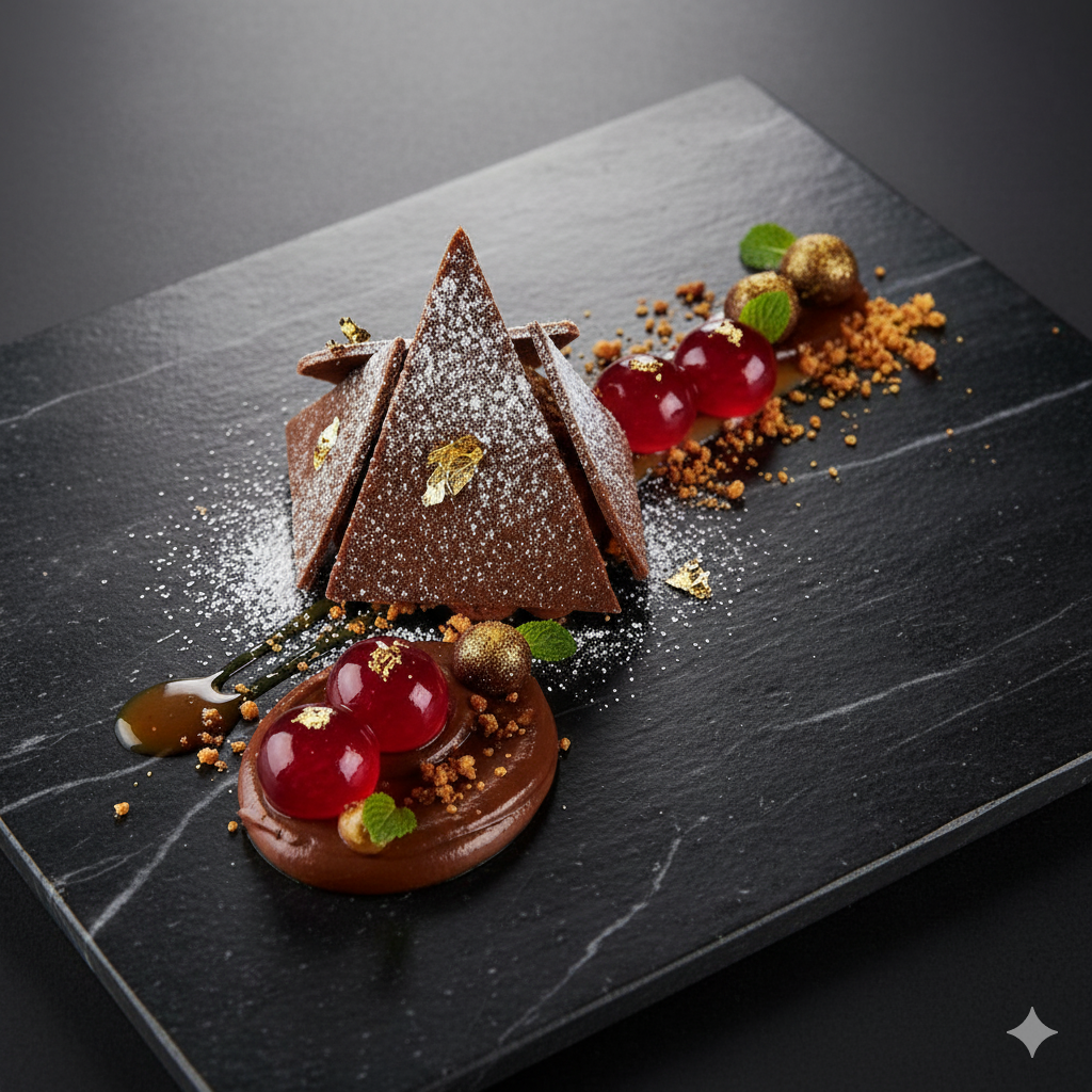프롬프트: 검은 대리석 접시 위에 정교하게 플레이팅된 디저트, 금박 장식, 붉은 젤리 구슬, 위에서 비치는 부드러운 스튜디오 조명