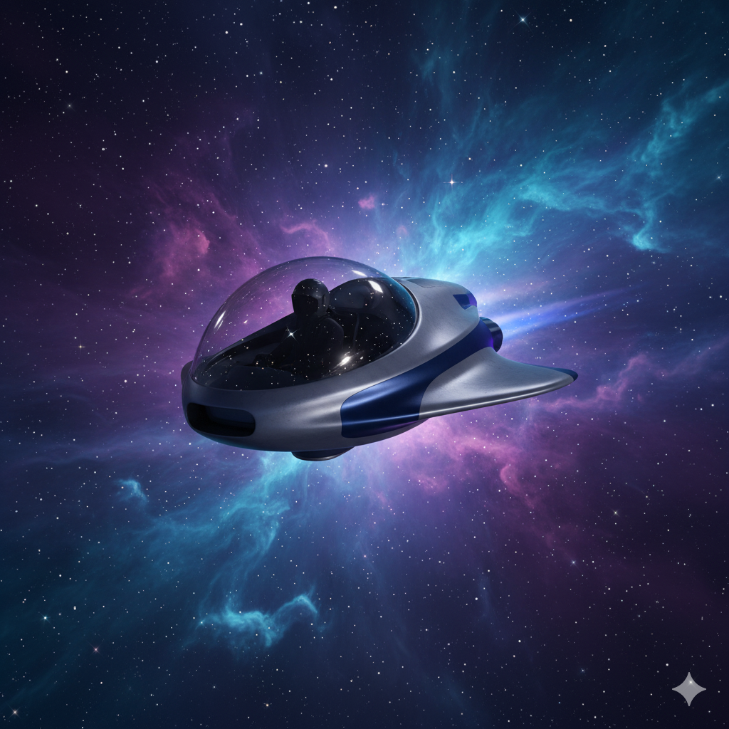 프롬프트: 보랏빛과 청록색이 섞인 성운 근처를 떠도는 작은 우주선, 반짝이는 별빛, 투명한 조종석에 비치는 조종사 실루엣, 사실적인 우주 일러스트