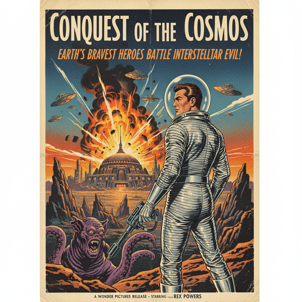 프롬프트: 1950년대 스타일의 공상과학 영화 포스터, 은색 슈트를 입은 영웅, 배경의 폭발 장면, 복고풍 활자체와 도트 질감