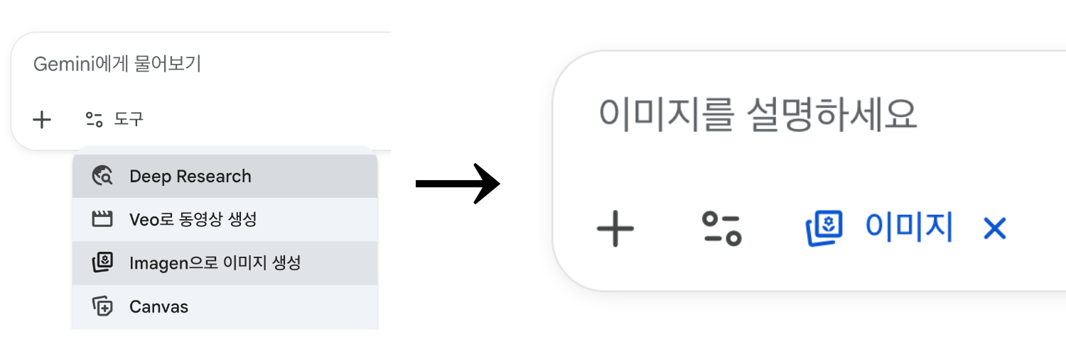 ① 제미나이(Gemini) 구글에서 서비스 중인 챗봇형 AI 서비스입니다. 웹에서 gemini.google.com에 접속하거나 스마트폰에 제미나이 앱을 설치해 사용할 수 있습니다. 가장 기본적인 사용법이며 이후 예제는 모두 제미나이를 기준으로 진행합니다. 사용 방법은 간단합니다. 웹 또는 앱에서 제미나이 실행 후 구글 계정으로 로그인합니다. 그런 다음 채팅 입력란에 있는 ‘도구’ → ‘Imagen으로 이미지 생성’을 클릭합니다. 채팅 입력란에 ‘이미지’ 표시가 생긴 후 원하는 이미지의 설명을 키보드로 입력하면 이미지가 생성됩니다.