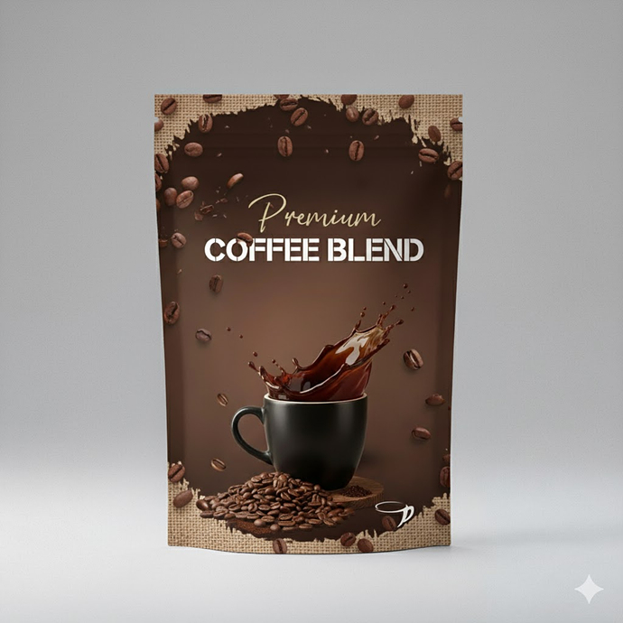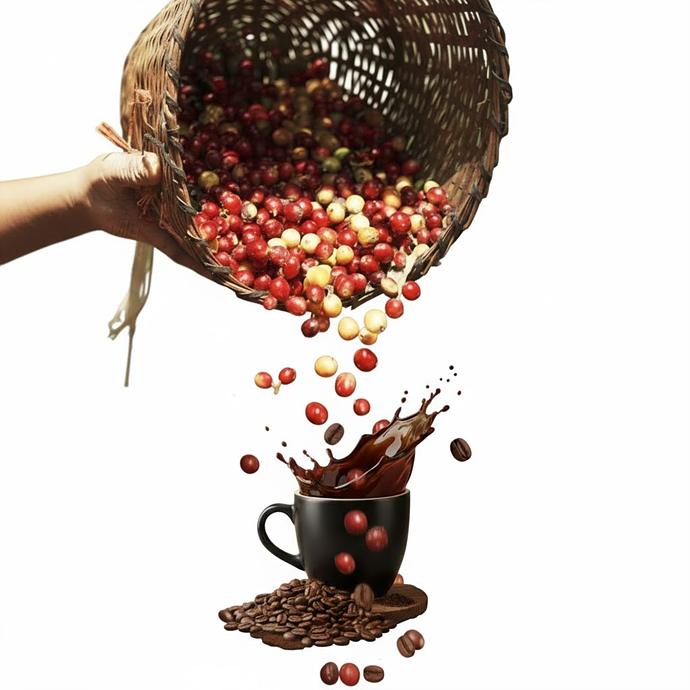 프롬프트: 오른쪽 이미지의 커피 생두가 떨어지면서 왼쪽 이미지의 패키지 속 커피로 변하는 모습을 입체감 있게 만들어줘.