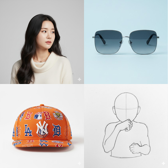 나노바나나를 사용해서 다양한 이미지를 합성하는 방법을 배워보겠습니다. 합성하려면 2개 이상의 이미지가 필요하겠죠. 아래의 4가지 사진은 이번 강좌에 필요한 원본 이미지의 예시입니다.