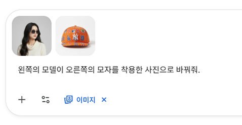 ② 모자 착용한 모델 합성하기 이번에는 모자를 착용해보겠습니다. 앞서 생성된 선글라스를 착용한 합성 이미지와 모자 이미지를 업로드한 후 다음 프롬프트를 입력합니다.