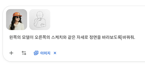앞서 선글라스와 모자를 착용한 모델의 자세를 바꿔보겠습니다. 위의 단계에서 생성된 모델 사진과 원본 이미지 중 자세 스케치 이미지를 제미나이에 업로드 한 후 아래 프롬프트를 입력합니다.