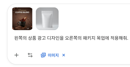 위 왼쪽의 상품 광고 이미지와 오른쪽의 패키지 목업 이미지를 채팅 입력란에 업로드 한 후 아래 프롬프트를 입력합니다.