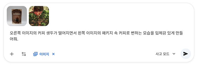 ⑤ 효과 합성하기 상품 이미지만으로도 좋지만, 이 이미지를 광고용으로 사용하기에는 부족할 수 있습니다. 눈길을 끌 수 있는 효과를 추가해보겠습니다. 앞서 생성한 커피 패키지 이미지와 원본 이미지 중에서 바구니에 들어있는 커피 생두를 쏟는 사진을 채팅 입력란에 업로드 한 후 아래 프롬프트를 입력합니다.