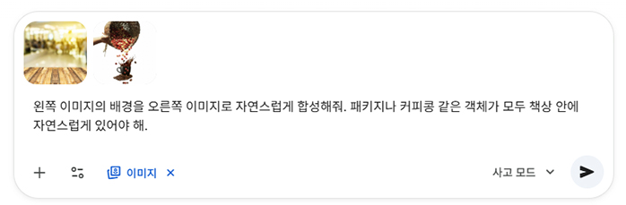 ⑥ 배경 합성하기 마지막으로 효과까지 추가한 상품 이미지에 알맞은 배경을 추가하겠습니다. 앞 단계에서 생성한 이미지와 원본 이미지 중에서 흐린 배경을 뒤로한 나무 테이블의 이미지를 채팅 입력란에 업로드 한 후 아래 프롬프트를 입력합니다.