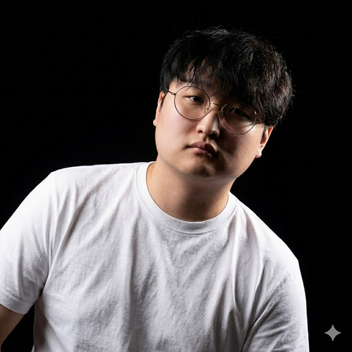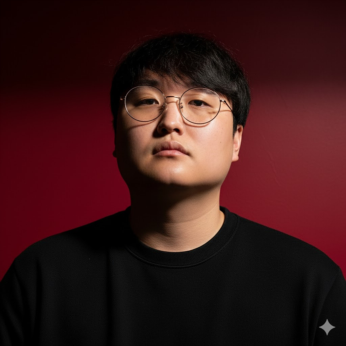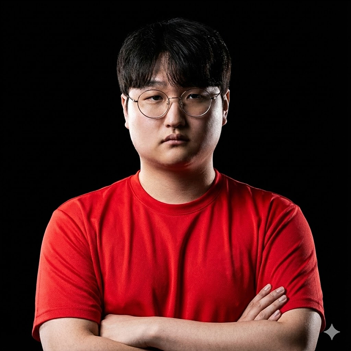 프롬프트: 사진 속 인물에게 빨간색 티셔츠를 입혀줘. 강한 대비 조명을 사용하여 e스포츠 선수 사진처럼 어두운 분위기를 연출하되, 배경은 e스포츠 스타일에 맞게 순수한 검은색이어야만 해. 인물은 프레임 중앙에 배치하고, 팔을 가슴 위로 교차한 채 카메라를 똑바로 바라보며 정면을 향해 곧게 서있도록 해줘.
