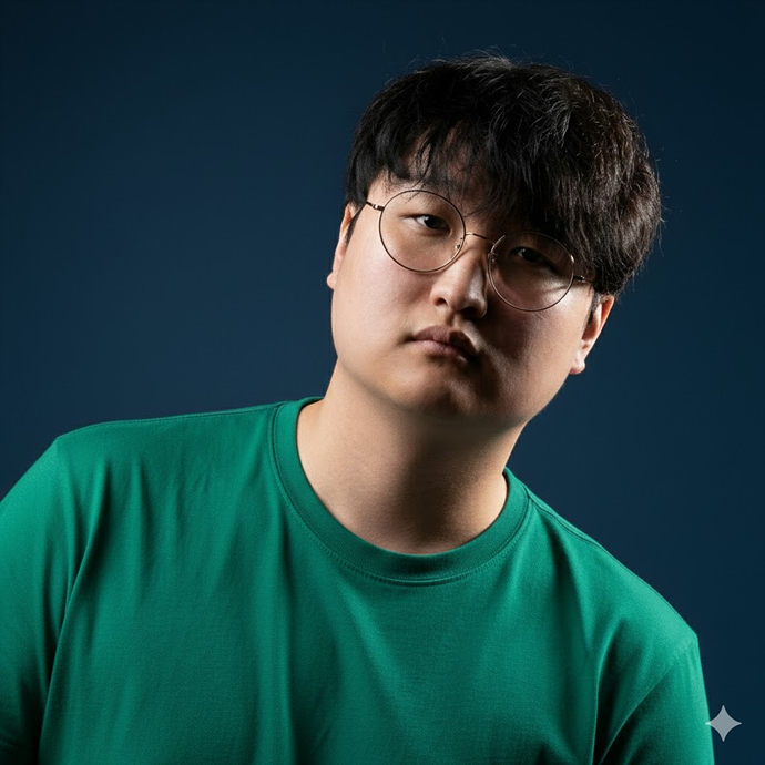 프롬프트: 사진 속 인물의 스튜디오 사진을 만들어줘. 녹색 티셔츠를 입고 있으며 몸을 살짝 기울인 인물을, 측면에서 조명이 비치는 파란색 배경 앞에서 촬영한 사진을 만들면 돼.
