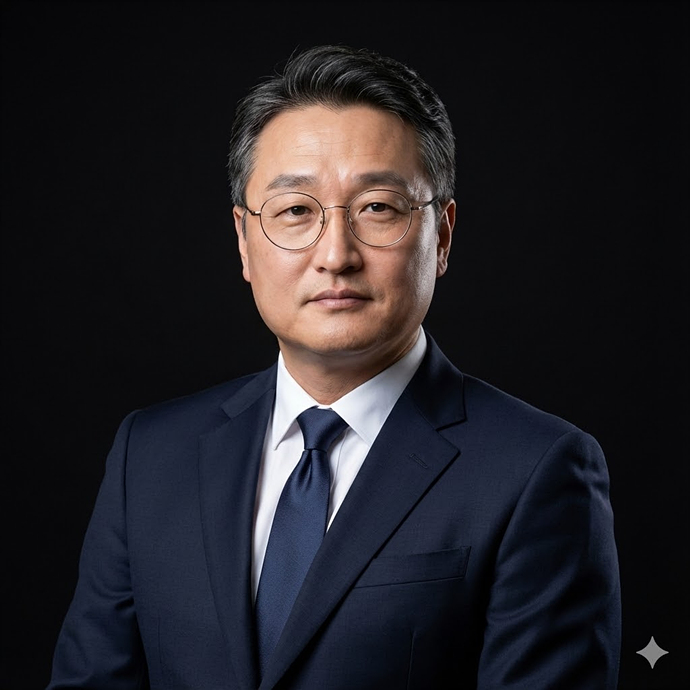 프롬프트: 위의 원본을 검은색 배경의 스튜디오에서 촬영한 사진으로 바꿔줘. 인물의 얼굴 특징은 동일하게 유지하되, 연령을 높여서 50대 초반의 성공한 칼럼니스트 또는 작가의 모습으로 바꾸고 싶어. 달라진 나이와 신분에 걸맞게 복장은 정장으로 변경하고 머리 모양도 50대 작가라는 직업에 어울리게 해줘.