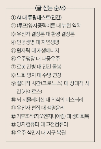 과학은 언제나 ‘대립’ 속에서 진보해왔다. 뉴턴과 아인슈타인, 다윈과 라마르크, 유전자와 환경, 인간과 기계의 긴장은 단순한 논쟁이 아니라 새로운 패러다임의 출발점이었다. 오늘날 인공지능과 생명공학, 우주과학이 다시 한번 인류의 사고방식을 뒤흔드는 시대에, 우리는 ‘과학 대 과학’의 충돌 속에서 과학의 본질과 한계를 되묻는다. 새해부터 새롭게 독자들을 찾아가는 교양「에세이로 읽는 과학 대 과학」은 서로 다른 이론, 기술, 관점을 맞세워 보며 과학의 진화 과정을 이야기로 풀어내고자 한다. 물론, 이 연재의 목표는 최신 과학 담론을 단순한 기술 경쟁이 아니라 ‘사유의 장’으로 확장하는 것이다. AI와 로봇, 우주와 생명, 시간과 에너지 등 인간의 근본적 질문들이 다시 과학의 언어로 호출되고 있다. 각 편은 하나의 ‘대립’을 통해 과학의 논리와 철학, 그리고 그것이 인간의 삶에 미치게 될 영향에 대해 함께 탐구하고자 한다.