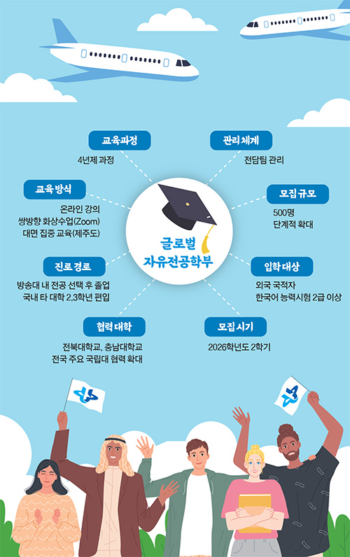 K-컬처가 세계적으로 유행하면서 많은 외국인들이 한국을 선호하고 있다. 이렇게 국제화된 현실을 반영해 2026학년도 2학기부터 외국인 유학생도 방송대(총장 고성환)에서 공부할 수 있게 된다. 국제협력단(단장 김재형)에서 2025년 TF를 발족해 외국인 유학생 유치 동향을 파악하고, 국내외 사례를 분석해 방송대에 적용할 수 있는 방안을 개발해온 노력들이 교수회의 최종 승인을 받으면 곧 결실을 볼 예정이다. 본격적으로 해외유학생을 유치하게 될 ‘글로벌자유전공학부’ 계획안을 살펴봤다.