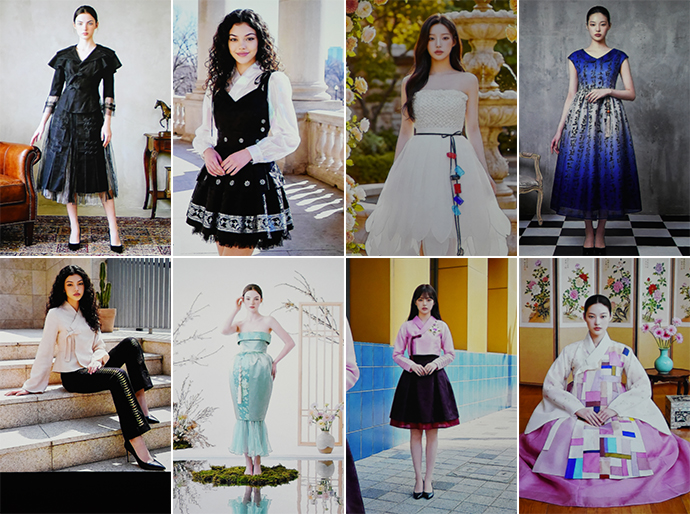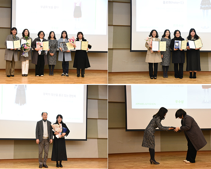 다음 순서는 ‘온라인 전시’ 영상 시연이었다. 수상 작품들을 실제 모델이 아닌 가상 모델이 착용한 모습을 AI로 생성한 다채로운 이미지들이 관객들의 시선을 사로잡았다. 영상 시연이 끝나고 진행된 시상식에서 영예의 대상은 우리의 민족성과 역사를 검은색 드레스에 담아낸 장은정 학우의 「광복의 정신을 품고 있는 한민족」이 차지했다. 그 밖에 최우수상은 김소영·오로라·전태희·정효원 학우가, 우수상은 우수상 강미현·문영희·박성희·오미숙·윤선희·이해진·임영자·전현경·정경미 학우가 수상했다.