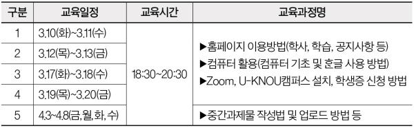 3월에는 신·편입생에게 생소한 학사, 학습, 공지사항 확인 등을 할 수 있는 방송대 홈페이지 이용방법부터, HWP 프로그램 사용법, Zoom과 U-KNOU캠퍼스 설치법, 학생증 신청 방법 등을 알려준다. 마지막 5주차 교육에서는 학생들이 가장 어려워하는 중간과제물 작성법과 업로드 방법을 강의하니, 서울지역 신·편입생이라면 놓치지 말고 신청하자.