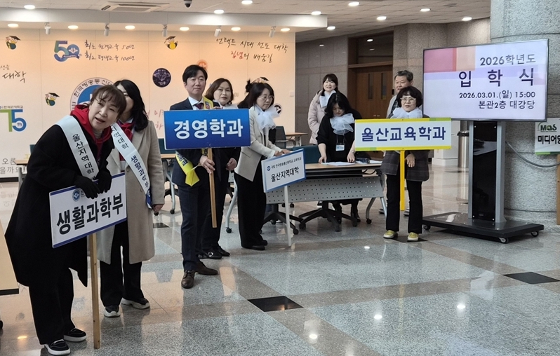 이관용 학장을 비롯해 김옥태 교수(미디어영상학과), 박상현 생활체육지도과 학과장, 윤희순 행정실장, 황정환 울산총동문회장, 김영길 중구청장이 참석했다.