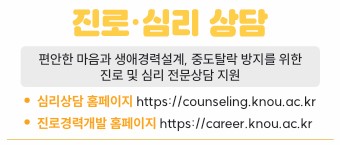 생애경력설계 및 취·창업 관련 특강과 마음건강 증진 특강 및 심리검사 워크숍도 제공한다. 궁금한 사항은 전화(02-3668-4490)로 문의하면 된다.