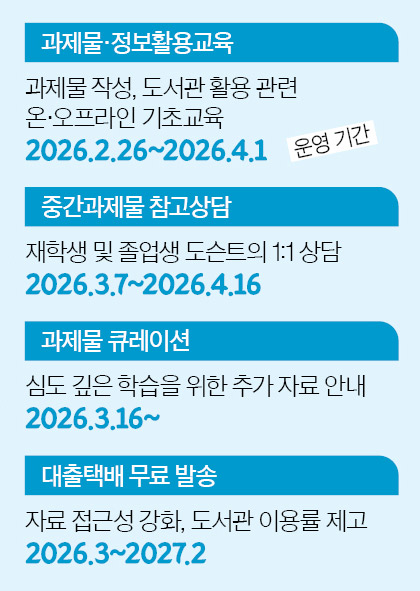 전년도에 이어 2026학년도에도 ‘대출택배 무료 발송’ 서비스가 시행된다. 전국 학생들의 자료 접근성 강화, 학습지원의 범위 확대, 도서관 이용률 격차 해소 등이 목적이다. 단 무료 발송은 대출택배 한정이므로 복사택배는 착불로 발송되며, 반납 시엔 이용자가 직접 방문하거나 택배 비용을 부담해야 한다. 2026학년도 시행 기간은 3월부터 내년 2027년 2월까지이며, 책정된 예산이 소진될 경우 그보다 조기에 마감될 수도 있다.