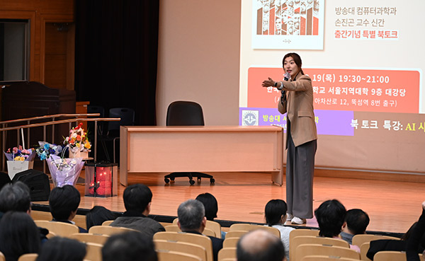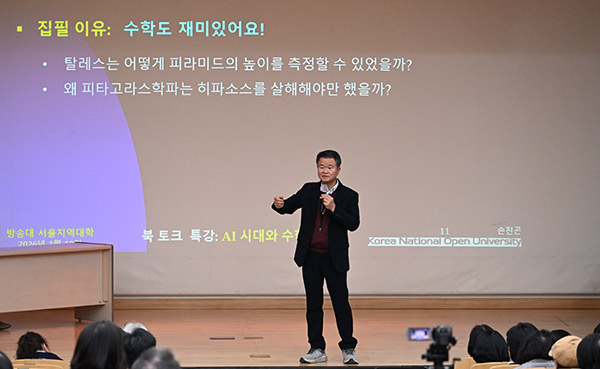 참석자들의 긴장을 풀기 위한 난센스 퀴즈 후, 저자인 손 교수가 무대에 등장했다. 학부 시절 ‘수학사연구회’ 동아리를 이끌었던 그는 수학도 복잡한 공식 대신 이야기를 활용하면 흥미롭게 배울 수 있음을 깨달은 것이 집필의 계기가 됐다고 밝혔다. 또한 수학에 관한 지식이 컴퓨터과학 분야의 학습과 연구를 위한 자양분이며, 생성형 AI의 원리를 이해하는 데도 필수적이라는 점은 저명한 학자들과 방송대의 수많은 학우들이 입증해왔다고 덧붙였다.
