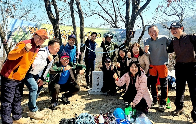 1주일 뒤인 3월 21일 오전 10시 피고개산 정상에 오른 묏골산악회 회원들은 정평래·김경화 동문 부부의 정상표지석 테이프 커팅식과 함께 산악인의 안녕과 학교 발전을 기원하는 시산제를 열었다.