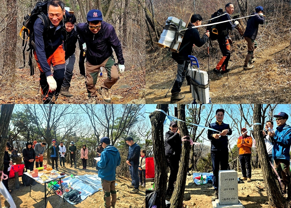 시산제에 앞서 3월 14일 묏골산악회 산우들은 회원인 정평래(경영)·김경화(행정) 동문 부부의 ‘방송대 30주년과 산악회 헌신’을 기념해 피고개산 정상에 정상표지석을 세웠다. 산행도 힘든 코스인데 김용동·정평래·김성길 동문이 110kg의 정상표지석을 직접 짊어지고 피고개산 정상까지 운반해 작업을 마쳤다.
