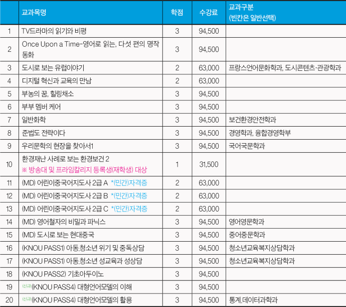 이외에도 「TV드라마의 읽기와 비평」, 「도시로 보는 유럽이야기」, 「디지털 혁신과 교육의 만남」, 「부농의 꿈」, 「힐링채소」, 「부부 멤버 케어」, 「일반화학」, 「준법도 전략이다」, 「우리문학의 현장을 찾아서1」, 「환경재난 사례로 보는 환경보건 2」, 「도시로 보는 현대중국」, 「아동·청소년 위기 및 중독상담」, 「기초아두이노」 등 다양한 과목이 있으니, 평소 관심 있던 분야라면 이번 기회에 꼭 신청해 보자.