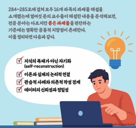 출제 교수들이 말하는 과제물 작성 비결을 살펴보기 전에 먼저 ‘명확한 공통점’을 좀더 들여다보자. 가장 많이 등장하는 강조점은 교재나 강의 내용을 그대로 옮기지 말라는 것이다. 그 대신 ‘나만의 목소리’, ‘나만의 문장’, ‘나의 언어’로 소화할 것을 요구한다. 이 경우, 단순 요약이 아닌 본인의 비판적 견해와 성찰을 담아야 한다.