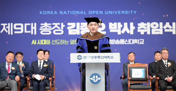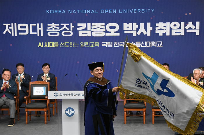 박수와 함께 단상에 오른 김종오 제9대 방송대 총장은 취임사에서 30년 전 뚝섬 서울지역대학의 한 강의실에서 만났던 열정의 눈빛들이 깨우쳐 준 ‘교육의 본질’을 지금도 기억하고 있다고 언급하며 “위기는 방향을 잃은 조직에게는 위협과 절망이지만, 방향을 아는 조직에게는 도약과 희망의 기회다. 반세기 이전에 디지털 유목민의 삶의 방식을 교육에 도입한 방송대가 첫째로 ‘디지털 포용’을 실천하는 따뜻한 미래 대학, 둘째로 ‘공공적 가치’를 굳건히 지키는 국립대학, 셋째로 ‘소통과 존중’이 살아 있는 공동체가 되도록 노력하겠다. 우공이산(愚公移山)의 마음으로, 낮은 자세로 듣고 약속한 바를 묵묵히 실천해, 4년 뒤 ‘방송대가 더 단단하게 도약했고, 더 따뜻해졌다’는 평가를 받을 수 있도록 혼신의 힘을 다하겠다”라고 선언했다. 구성원 대표들은 무대로 나와 김종오 신임 총장에게 꽃다발을 전달했다.