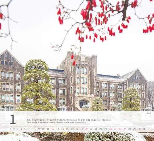 연세대는 기독교 교육 이념을 바탕으로 설립됐다. 이러한 가치는 달력에도 고스란히 묻어난다. 1월의 달력을 살펴보자. 눈이 소복이 쌓인 연세대 연희관을 배경으로 성경 말씀이 다음과 같이 씌여 있다. “우리는 하나님의 작품입니다. 선한 일을 하게 하시려고, 하나님께서 그리스도 예수 안에서 우리를 만드셨습니다(에베소서 2:10).”이러한 레이아웃은 계절적 분위기에 맞춰 1월부터 12월까지 똑같이 적용하고 있다. 연세대 홍보팀 관계자는 “연세만이 느낄 수 있는 사계절의 아름다움과 어우러지는 하나님의 말씀들이 우리의 일상 속에서 작게나마 위로와 평안이 되기를 바란다”고 전했다.