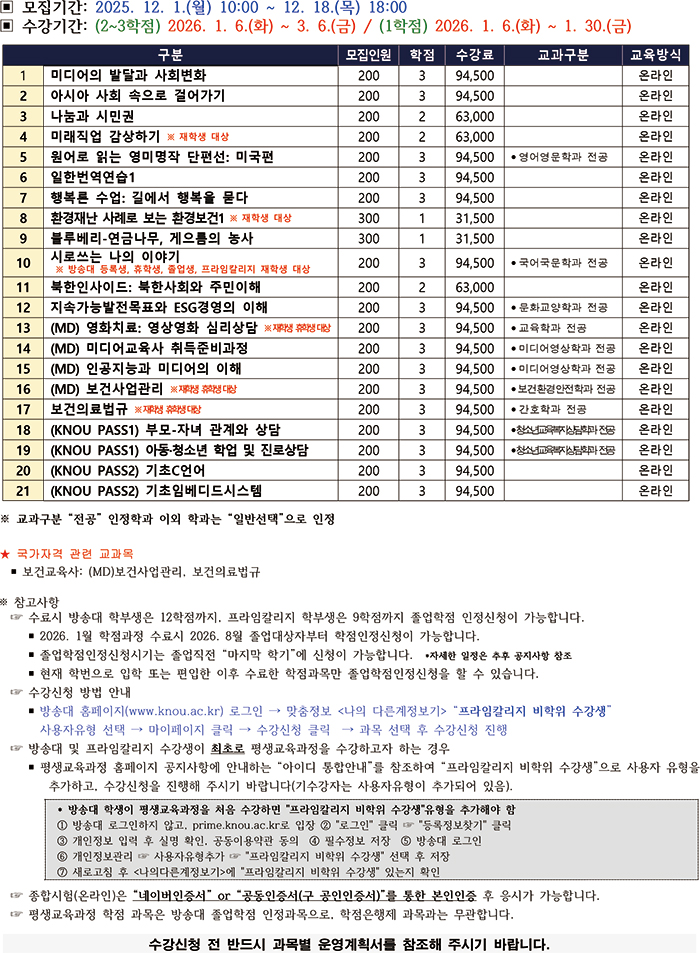 프라임칼리지 2026학년도 1월 학점과정 수강생 모집